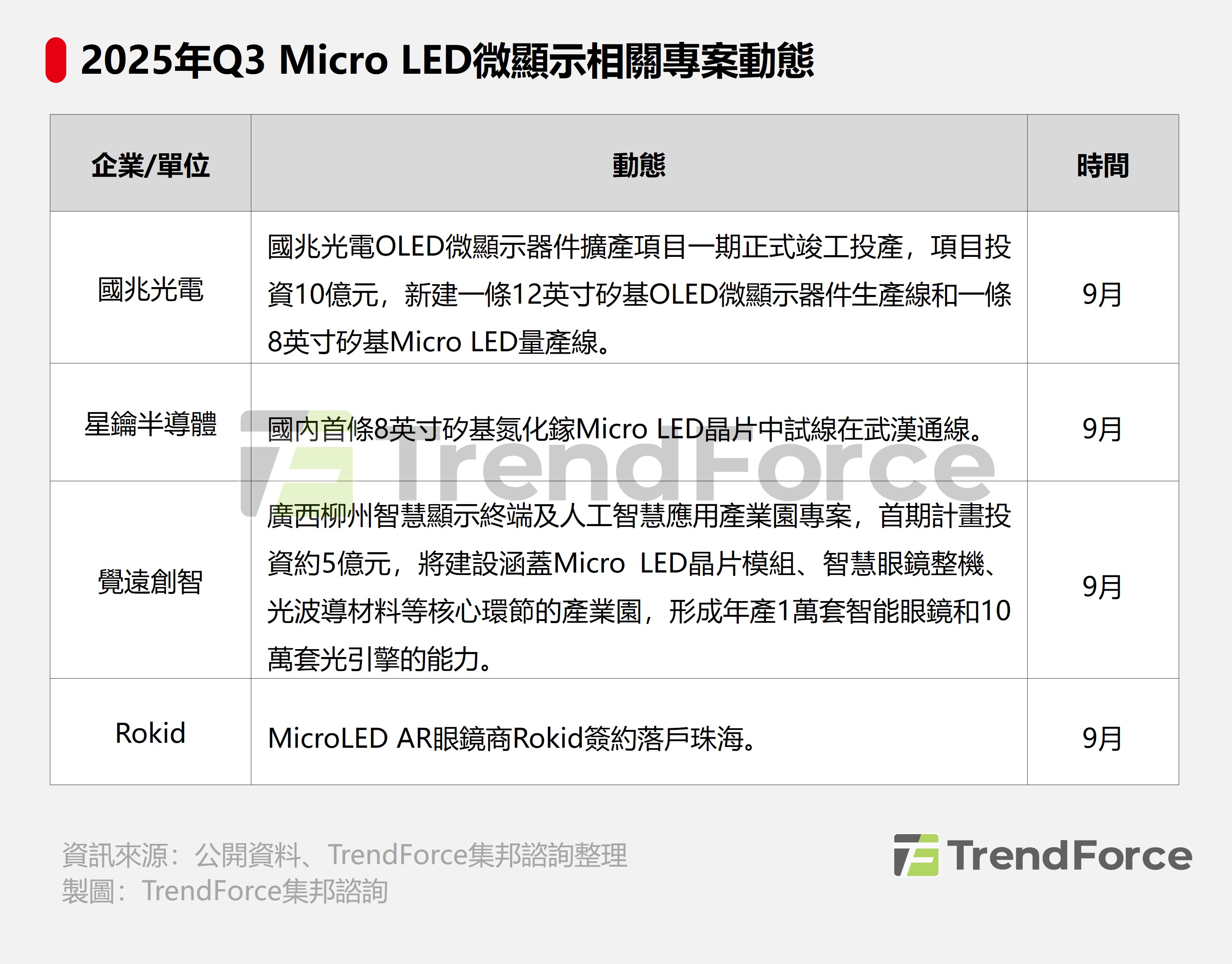 多個Micro LED微顯示技術相關項目在9月迎新進度